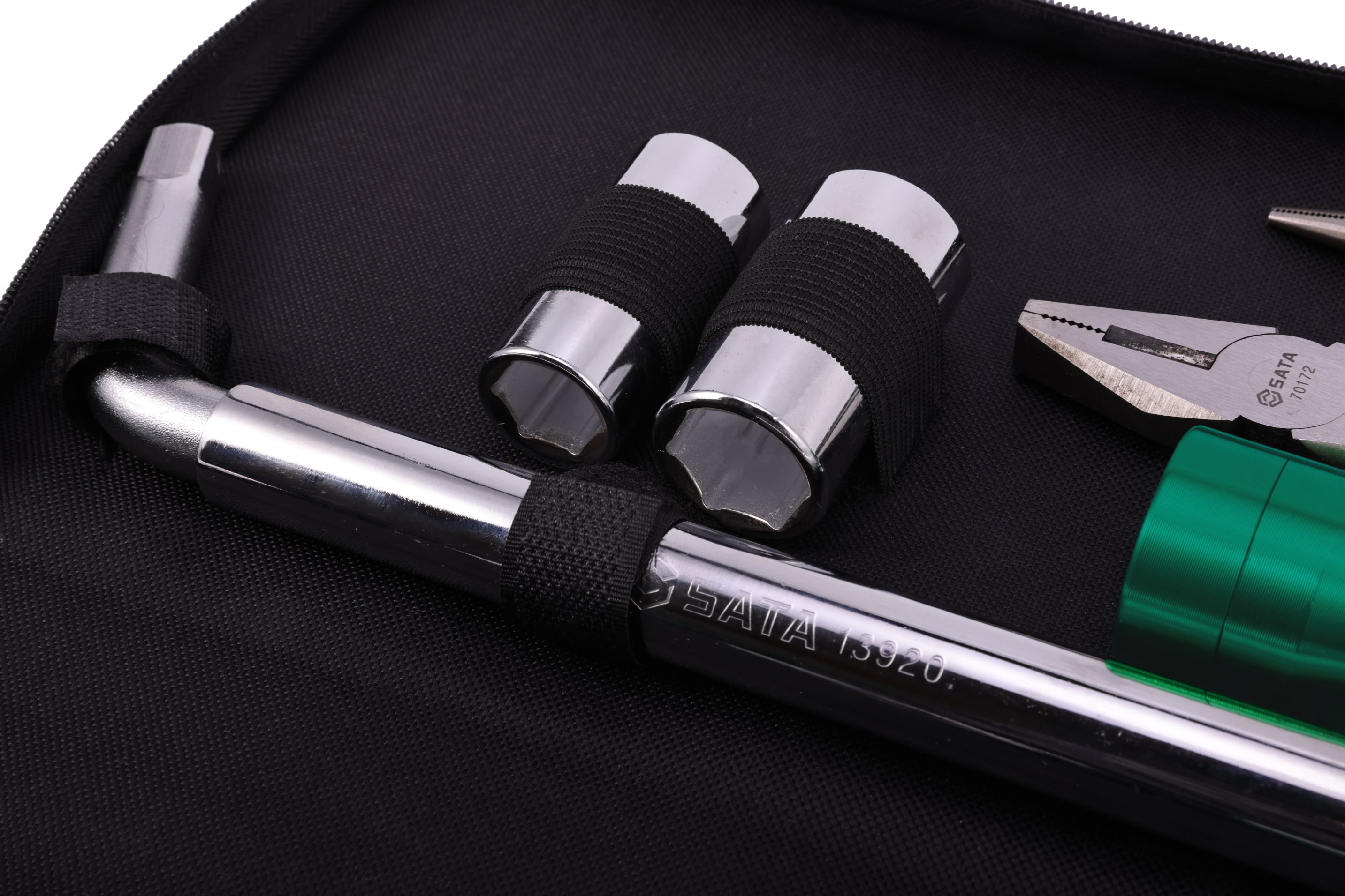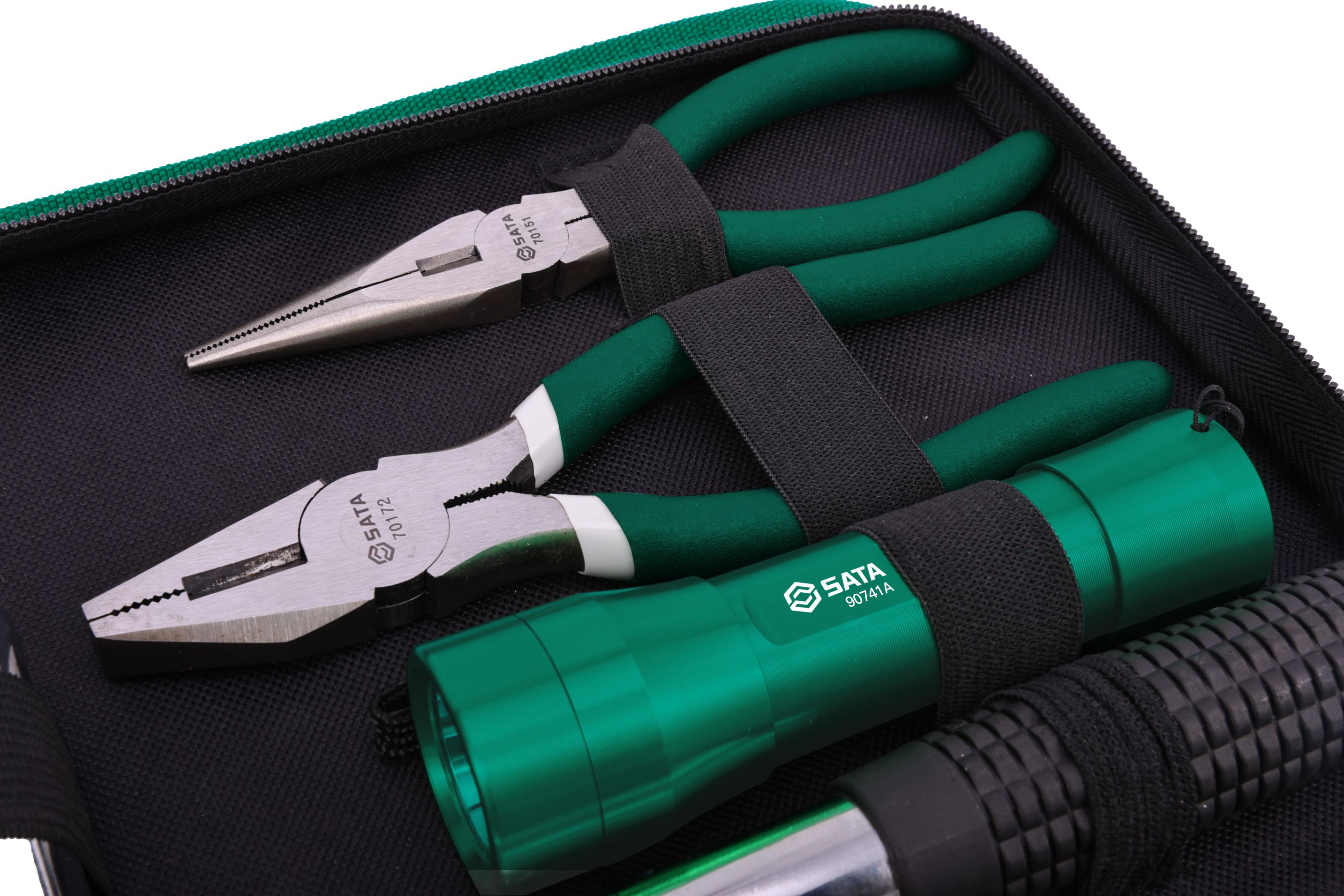 Content List 1 - 12.5mm series telescopic L-type tire wrench 2 - 12.5mm series double-ended socket 17x19mm, 21x23m 1 - Adjustable wrench 8” 1 - Linesman pliers 7" 1 - Long nose pliers 6" 1 - Slotted screwdriver 6x100mm 1 - Phillips screwdriver #2x100mm 1 - Tape measure 3mx16mm 1 - Snap-off knife 1 - Aluminum alloy flashlight