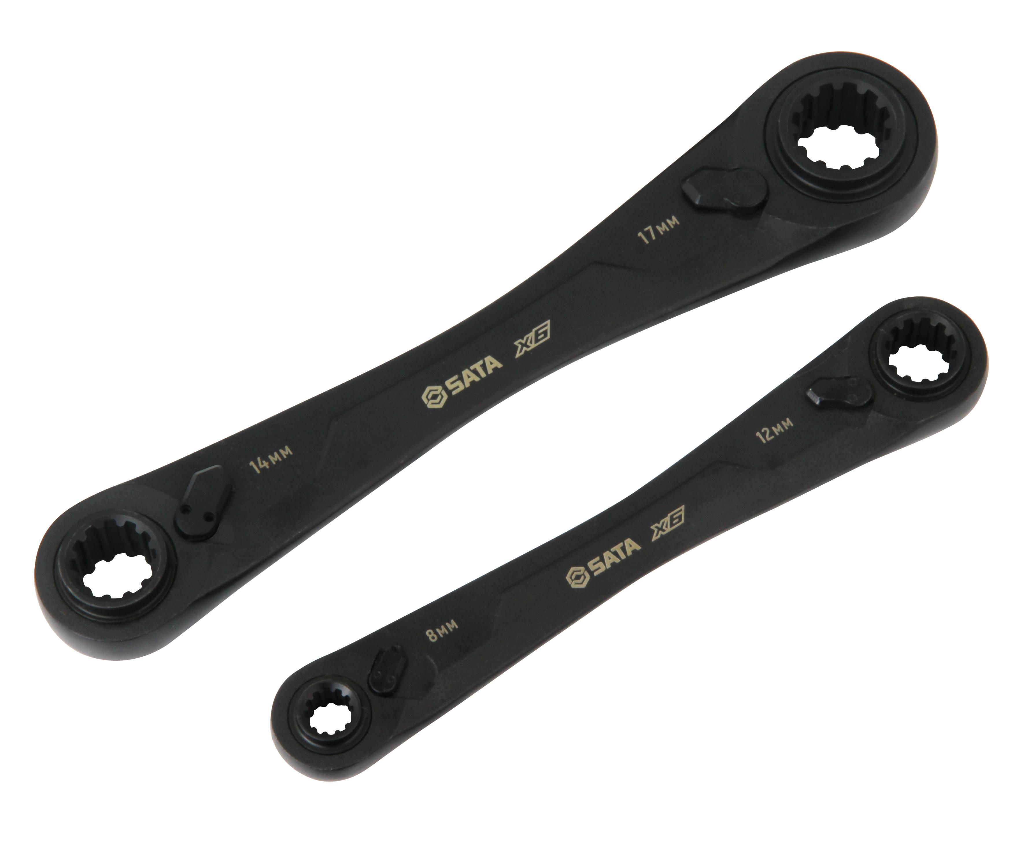 4 sizes per wrench: 8mm x 12mm, 10mm x 13mm and 14mm x 17mm, 15mm x 19mm