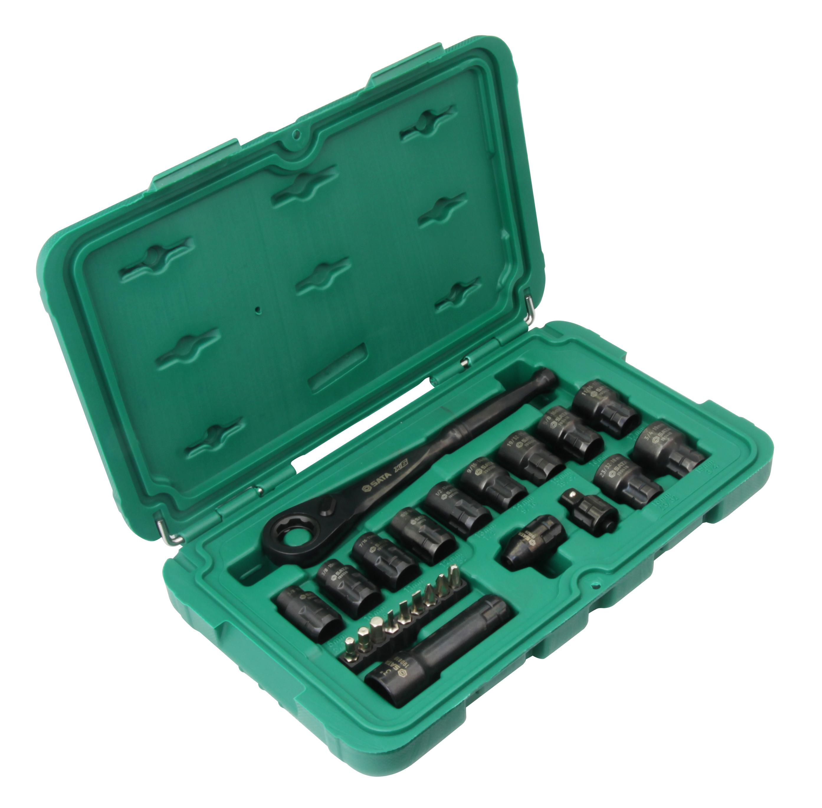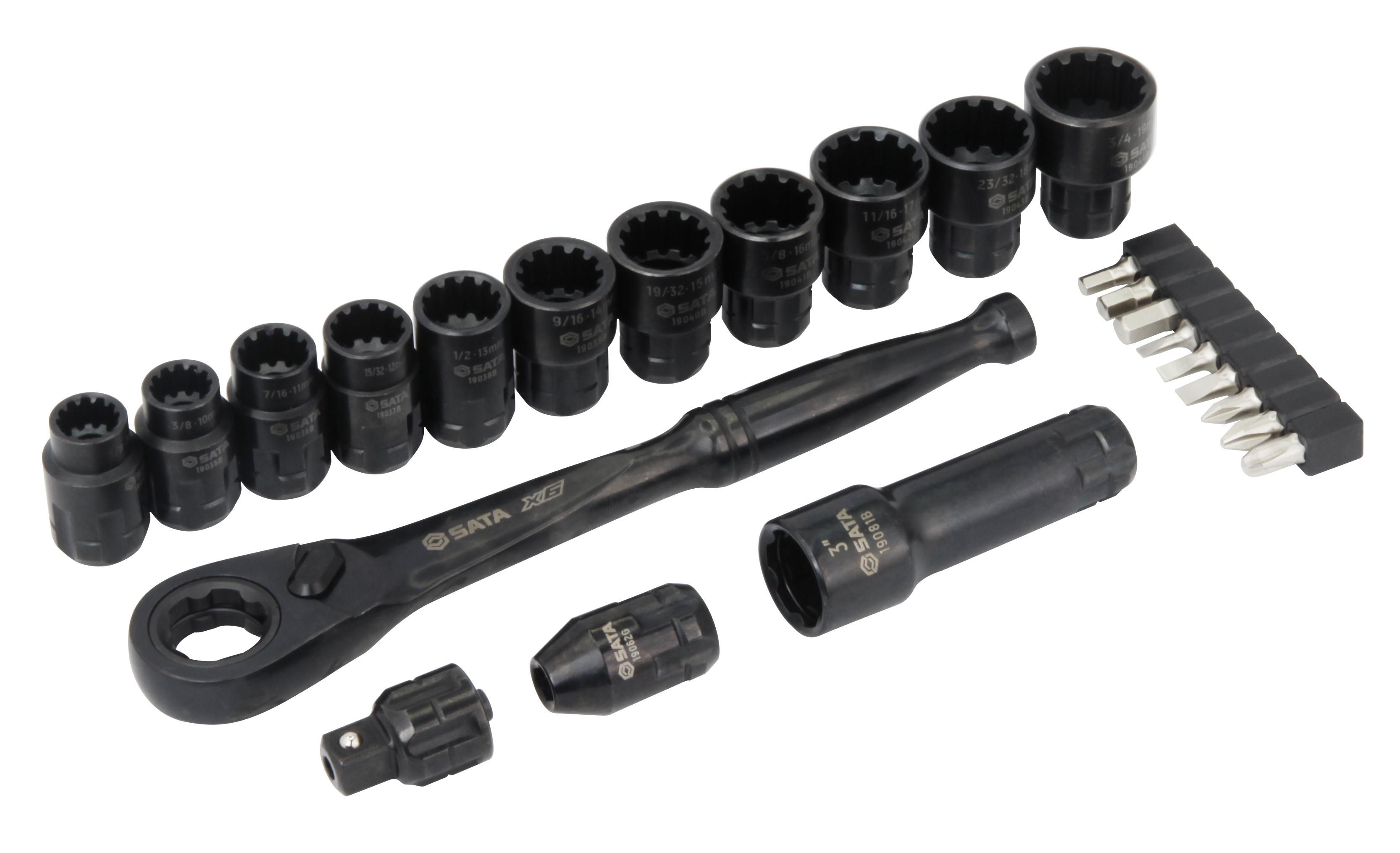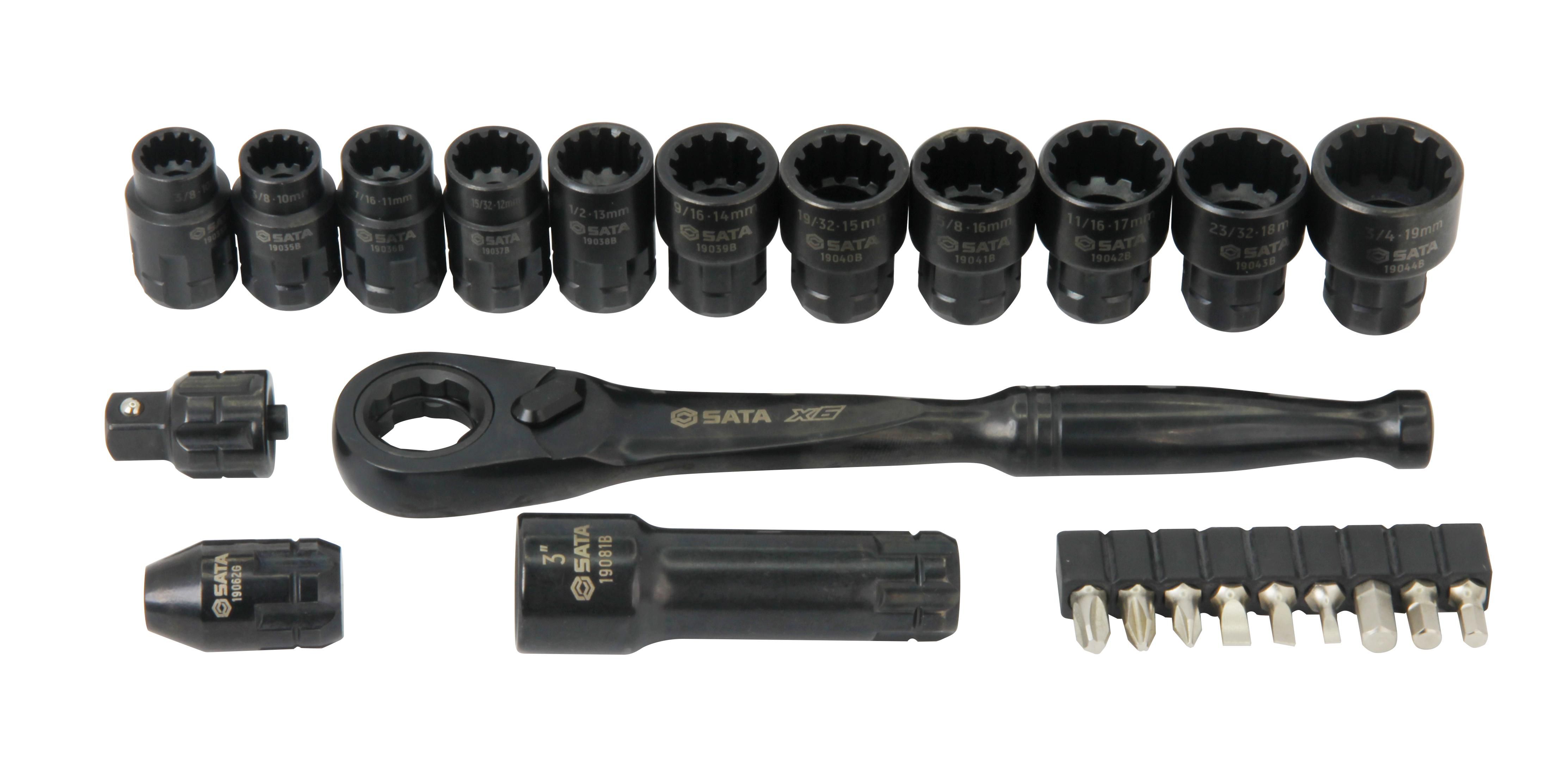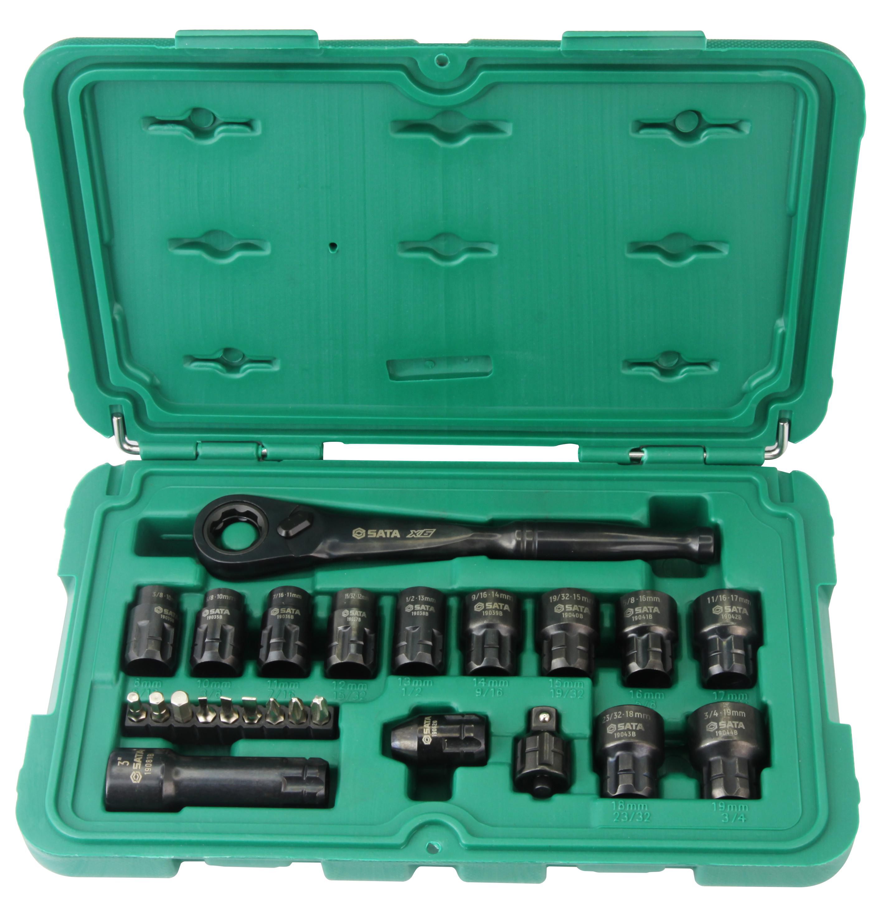 | Content | 11- 3/8" Drive Universal Pass-Thru Sockets 8 mm (5/16"), 10 mm (3/8"), 11 mm (7/16"), 12 mm (15/32"), 13 mm (1/2"), 14 mm (9/16"), 15 mm (19/32"), 16 mm (5/8"), 17 mm (11/16"), 18 mm (23/32"), 19 mm (3/4") 1- 3/8" Drive Pass-Thru Extension 3" 9 - 1/4" 25L Bits, Hex 4, 5, 6 mm, Phillips #1, #2, #3, Slotted 3, 4, 5 mm 1- 3/8" Pass-Thru Bit Adapter 1- 3/8" Pass-Thru Ratchet 1- 3/8" Pass-Thru Socket Adapter | ||