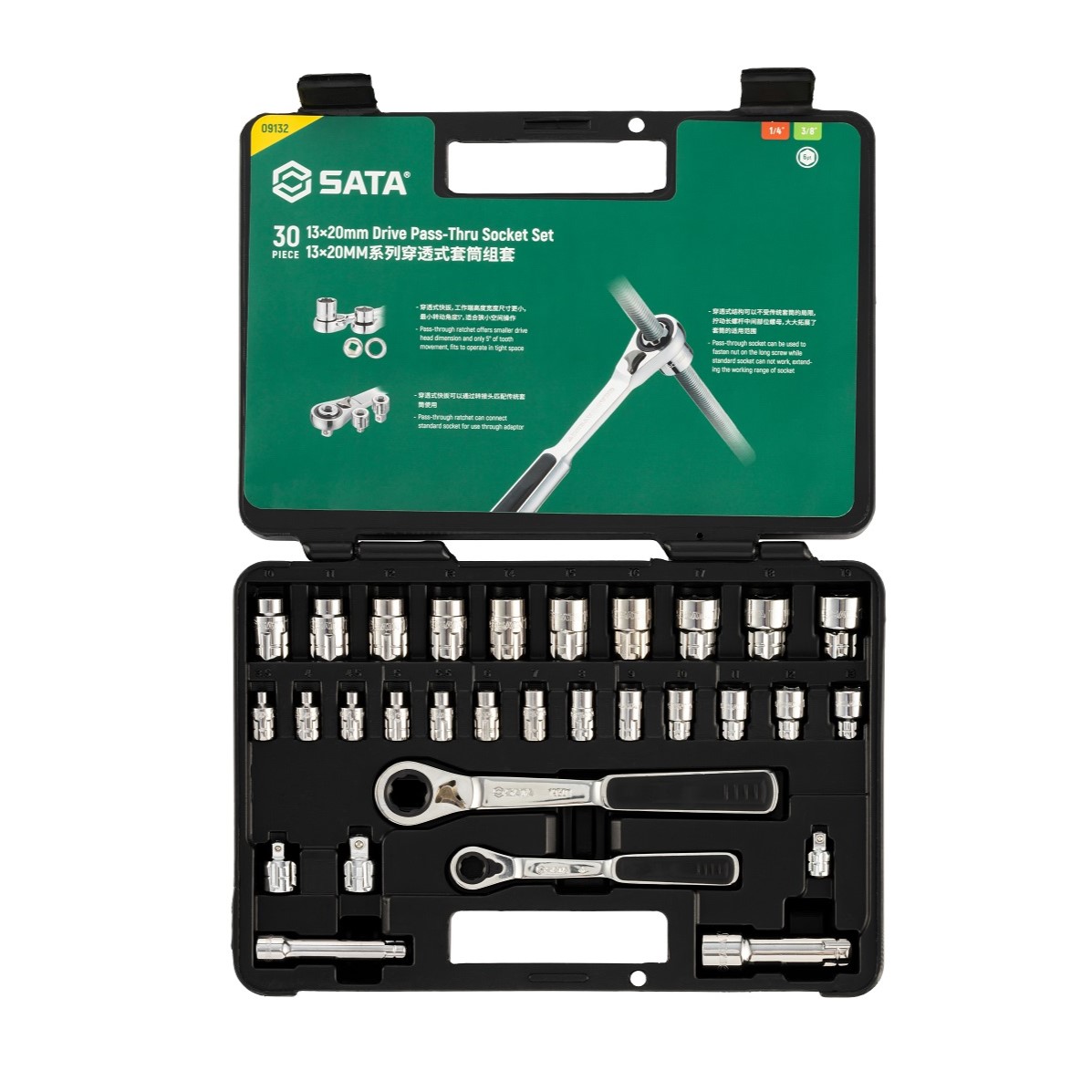 | Content List | 1 - 1/4” Dr. Pass-Thru® Ratchet 1 - 3/8” Dr. Pass-Thru® Ratchet 13 - 1/4”Dr. Metric Pass-Thru® Sockets 3.5, 4, 4.5, 5, 5.5, 6, 7, 8, 9, 10, 11, 12, 13 mm 10 - 3/8”Dr. Metric Pass-Thru® Sockets 10, 11, 12, 13, 14, 15, 16, 17, 18, 19 mm 5 - Accessories 1/4” Dr. Pass-Thru® Extension Bar 3” 1/4” Dr. Quick-Release Adapter 3/8” Dr. Pass-Thru® Extension Bar 3” 3/8”Dr. x 1/4”M Quick-Release Adapter 3/8”Dr. x 3/8”M Quick-Release Adapter | ||