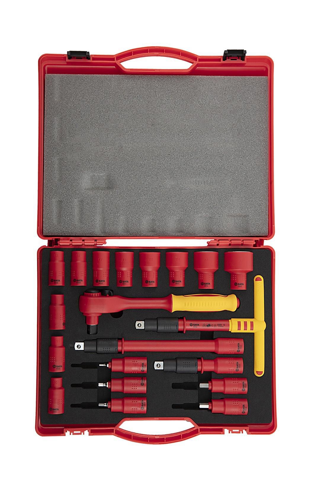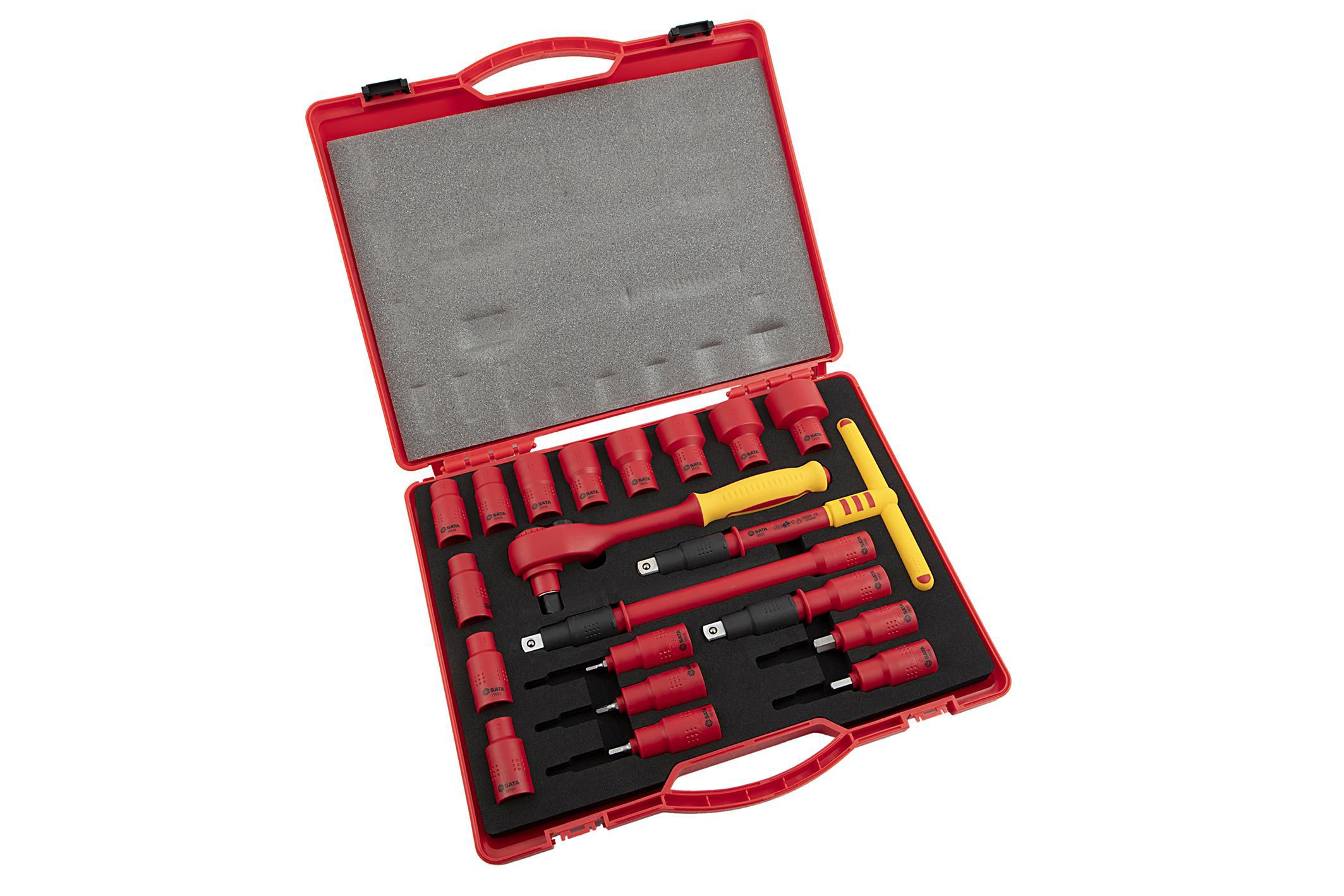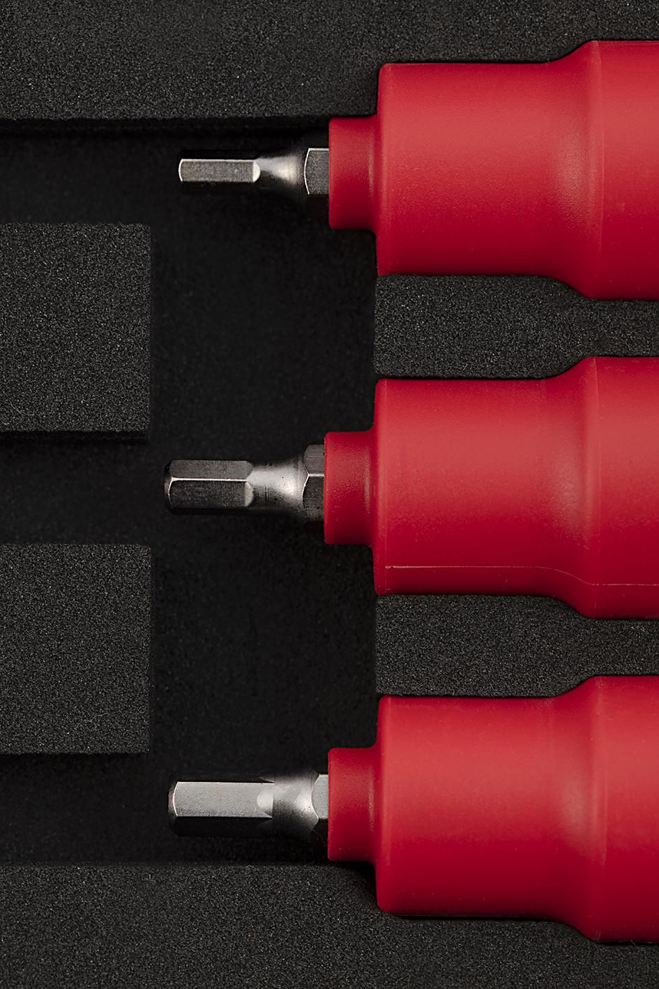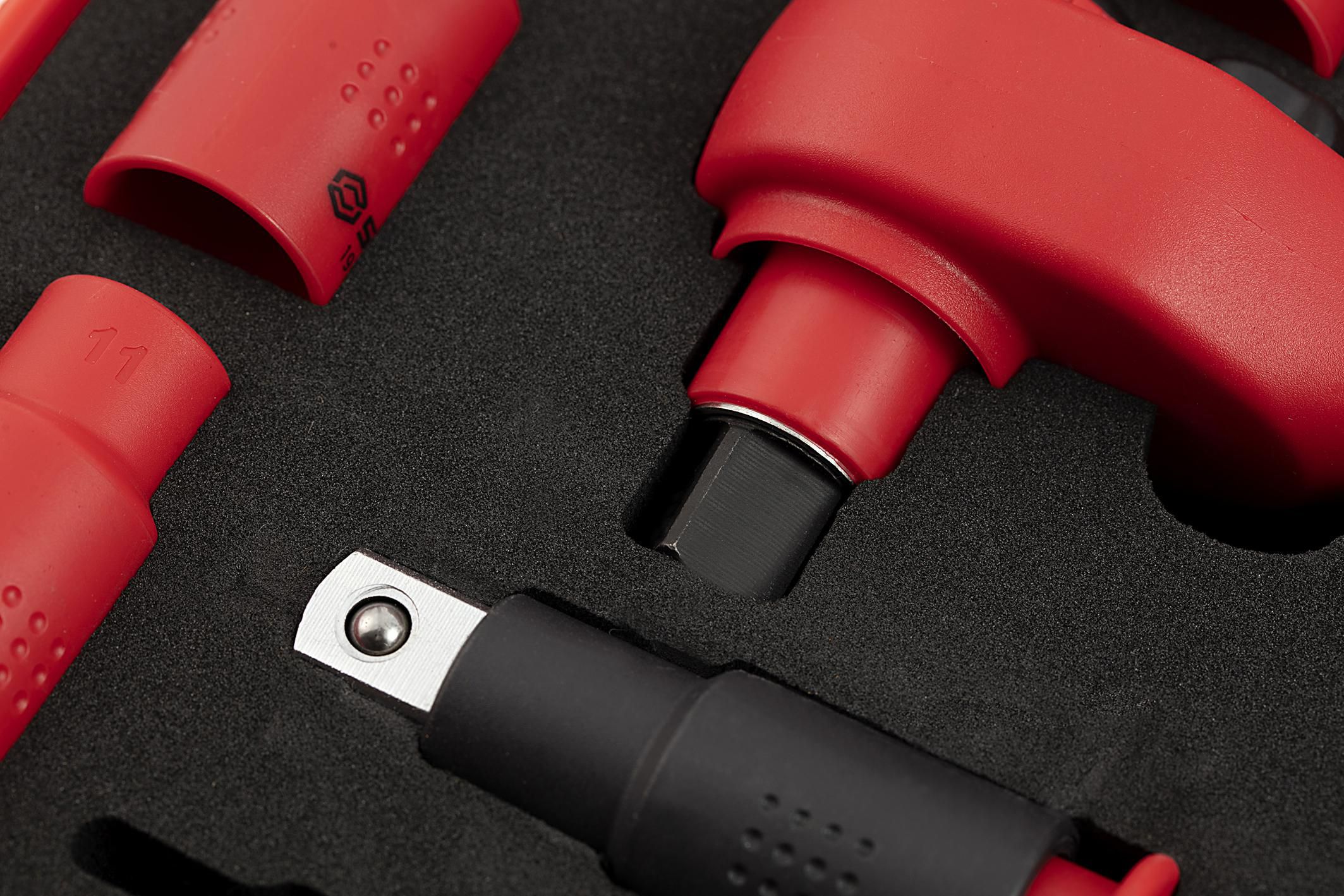 | Content | 1- 1/2" Drive Quick Release Ratchet 11- 1/2" Drive 6 pt. Sockets 10, 11, 12 ,13, 14, 17, 19, 22, 24, 27, 32 mm 5 - 1/2" Drive Bit Sockets Hex 4, 5, 6, 8, 10 mm 2- 1/2" Drive Wobble Extension Bars 5", 10" 1- 1/2" Drive T-Handle 8" | ||