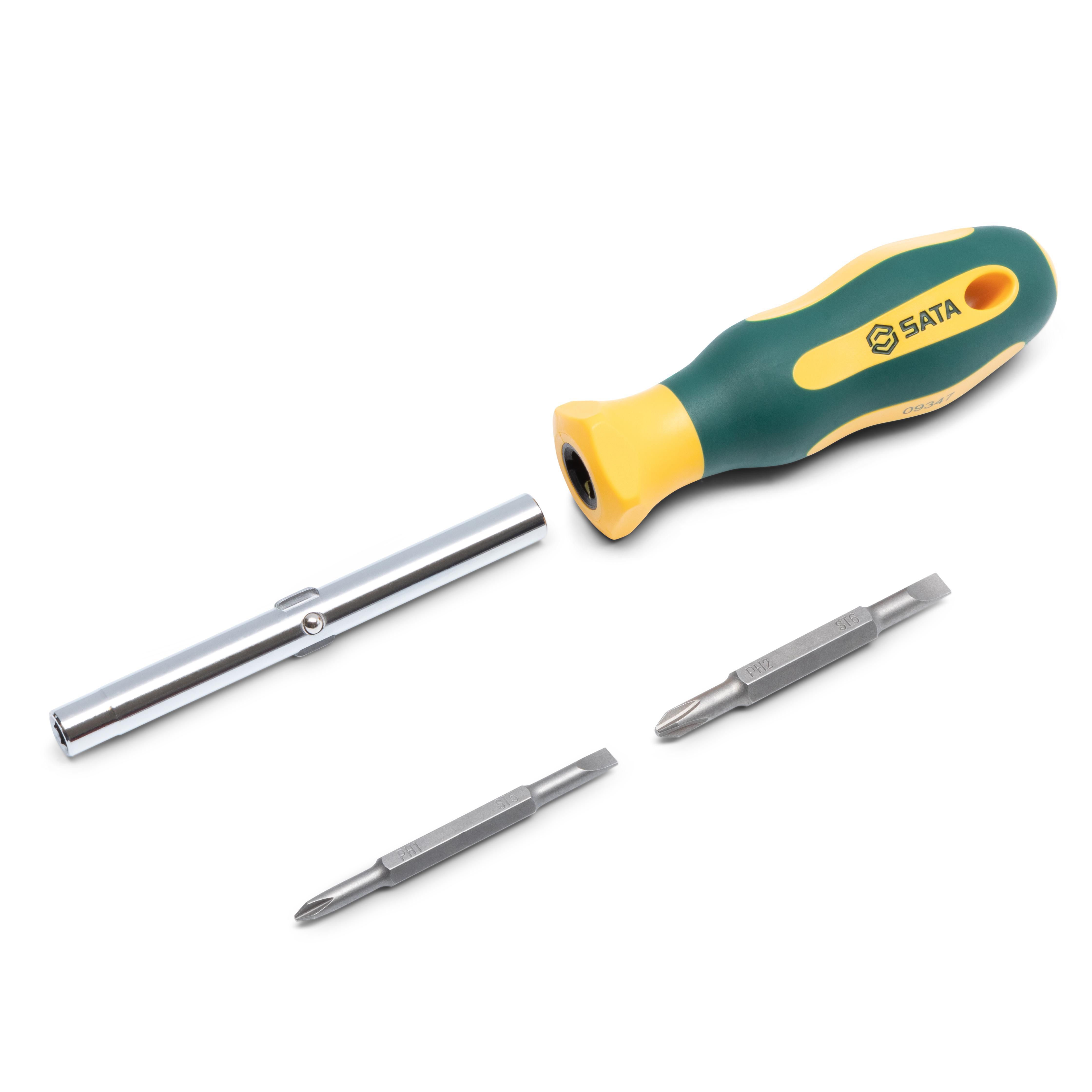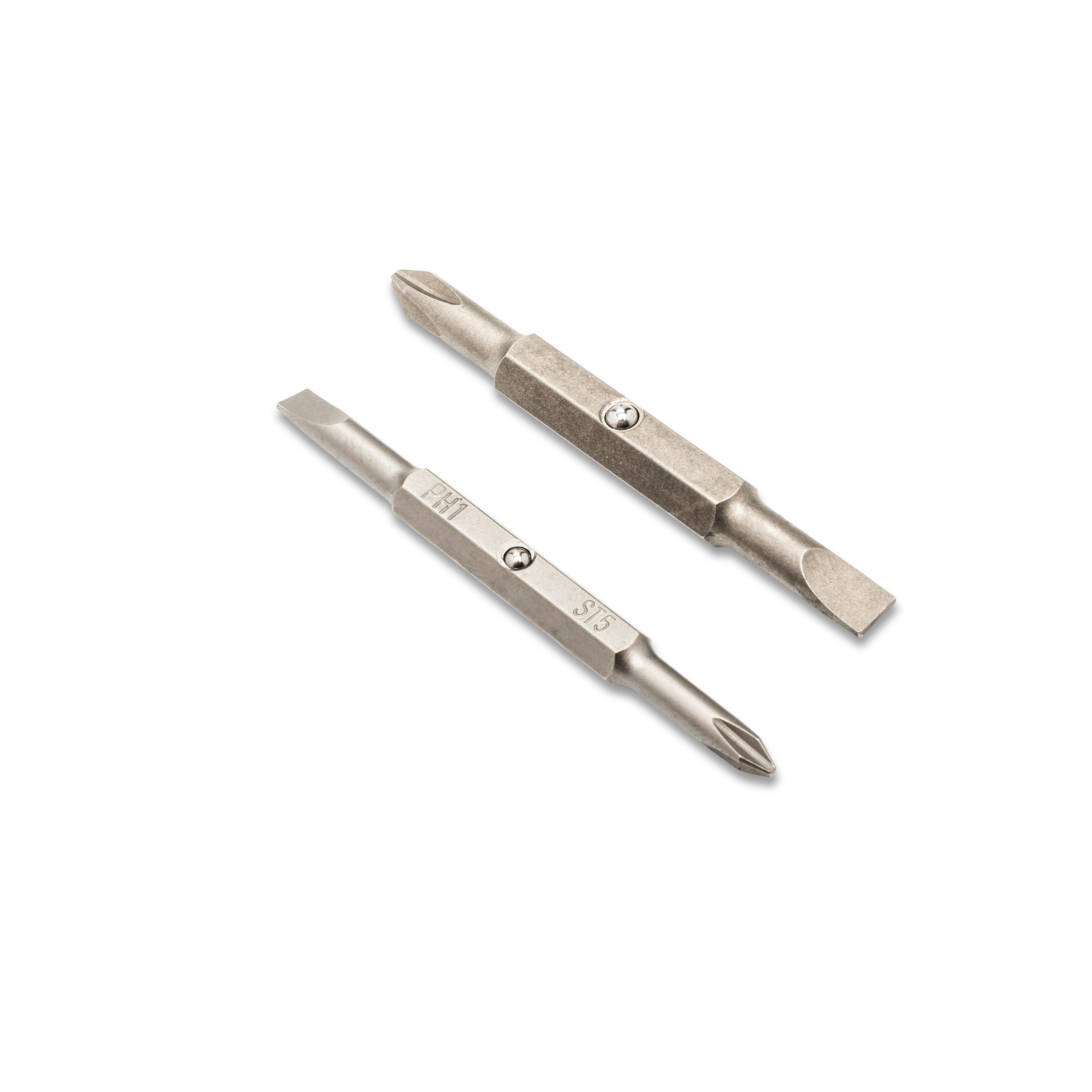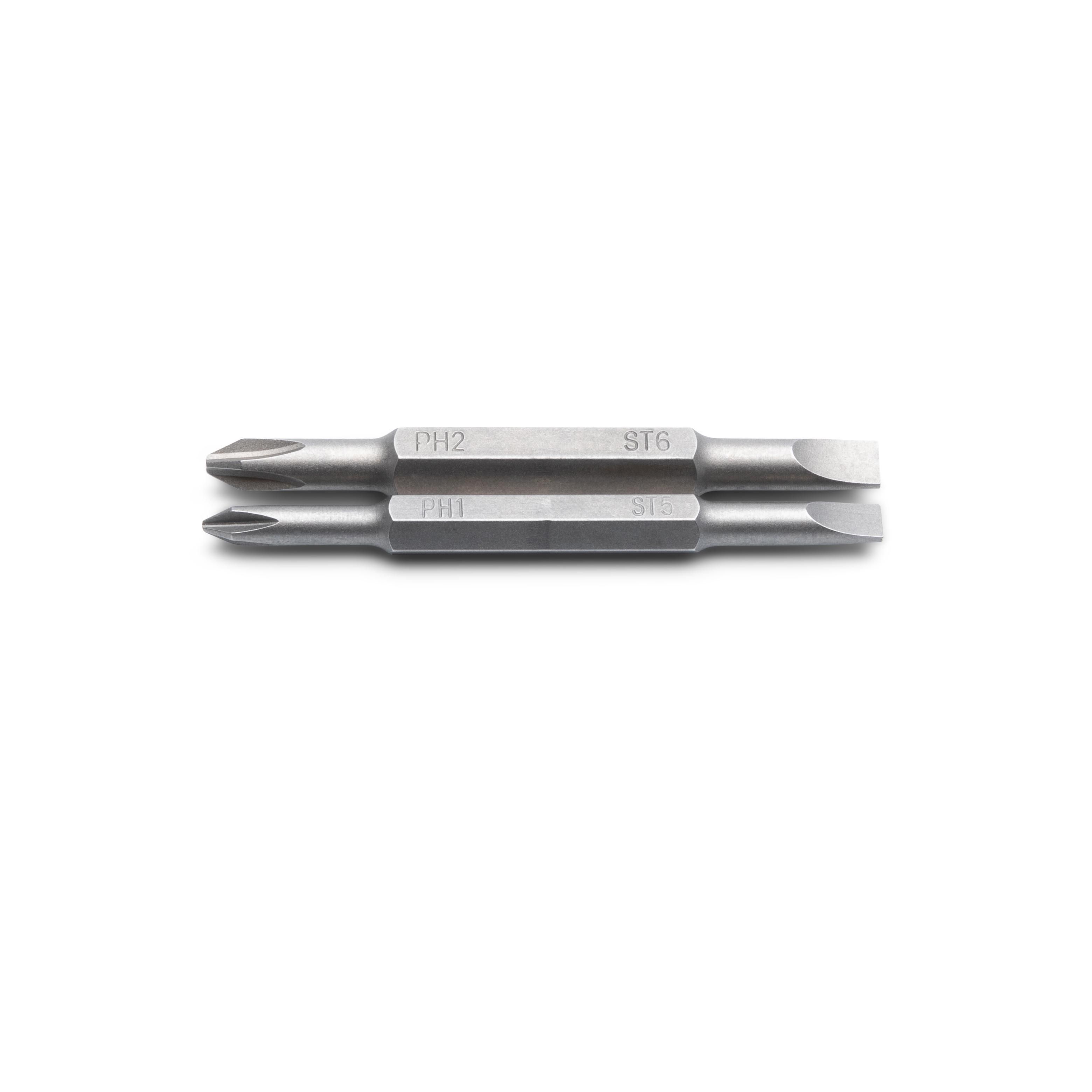 1 - Screwdriver handle (5/16" and 1/4" double ended shank) 2 - 75 mm double ended bits 5/16" - 6.0 mm x #2 (Slotted / Phillips) 1/4" - 5.0 mm x #1 (Slotted / Phillips)