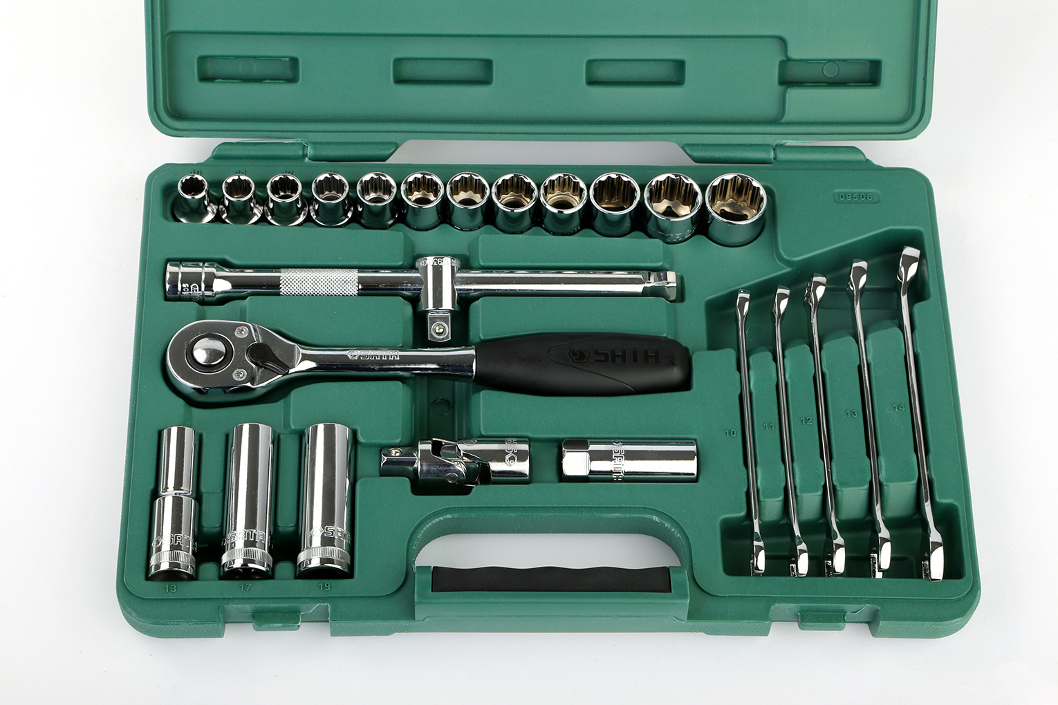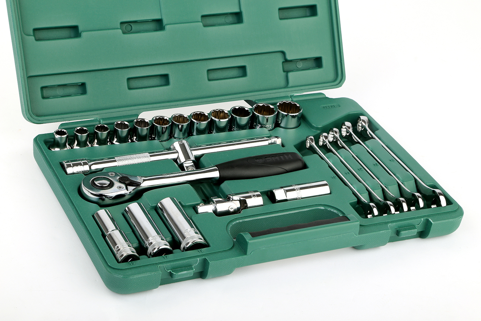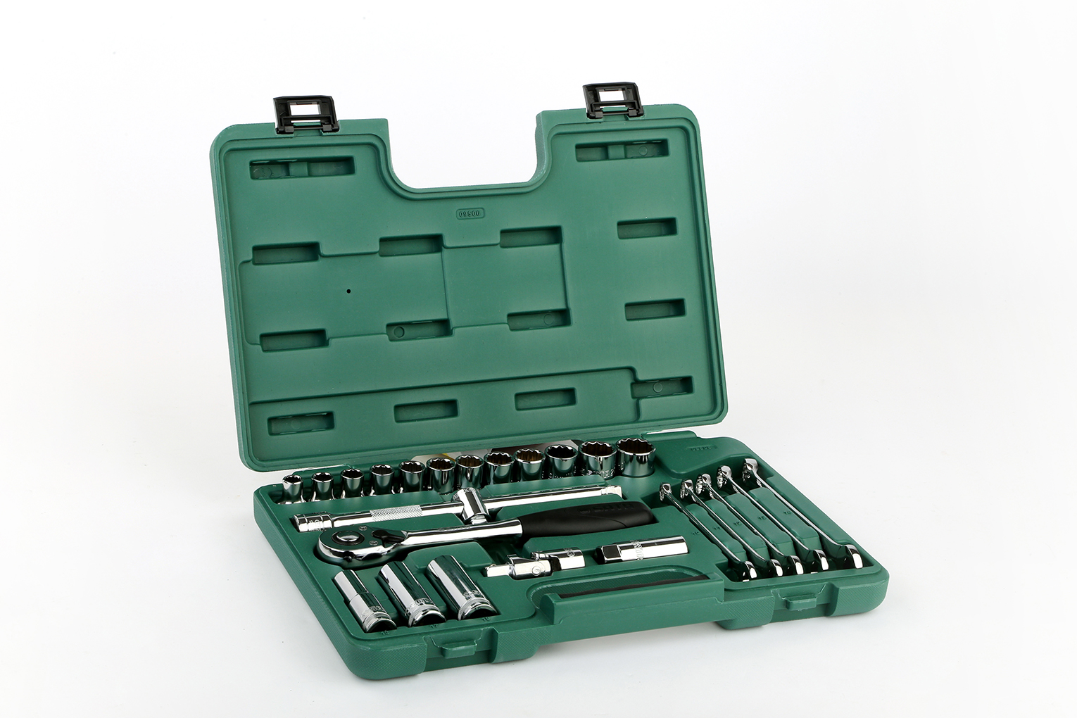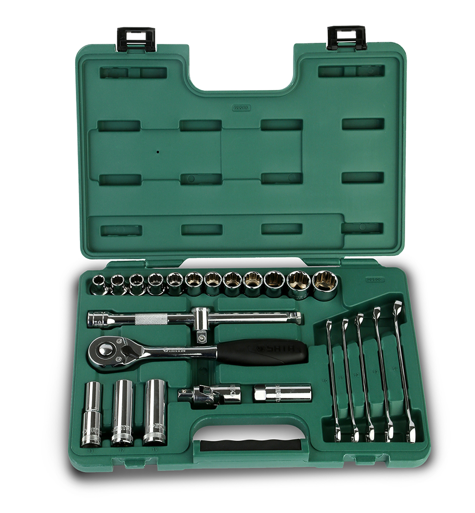 | Content List | 1 - 1/2" Quick-Release Ratchet 12 - 1/2" 12pt. Metric Sockets 10, 11, 12, 13, 14, 15, 16, 17, 18, 19, 22, 24 mm 3 - 1/2" 6pt. Metric Deep Sockets 13, 17, 19 mm 1 - 1/2" Spark Plug Socket 16 mm 5 - Metric Combination Wrenches 10, 11, 12, 13, 14mm 3 - Accessories 1/2" Wobble Extension 10" 1/2" Universal Joint 3/8""F x 1/2"M 3-Way Adapter |